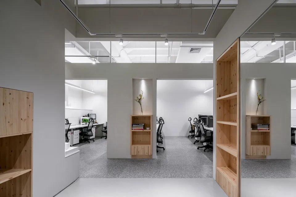 這是一個(gè)“解構(gòu)”的新型辦公室。與傳統(tǒng)的辦公場所不一樣,這里強(qiáng)調(diào)的是開放中又有私密,互動(dòng)和獨(dú)立相容。從整體來看,這是一個(gè)風(fēng)格較為硬朗粗獷的空間,我們?nèi)谌肓恕拔⒐I(yè)風(fēng)”的元素,但墻體一白色覆蓋,則彰顯出柔和與想象空間。
