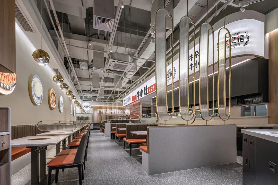 空間設計簡約而不簡單,提取牛小灶VI紅+白色+木色為餐廳主色調,延續前幾代店面的干凈純粹的風格,在升級中做到品牌價值與簡約設計理念的一脈傳承。地面Mo?意大利灰時尚水磨石,低調優雅的灰色系點綴層次分明的白色紋路,簡約而不失大氣,呈現出獨有的氣質,彰顯空間簡潔大方的美感。